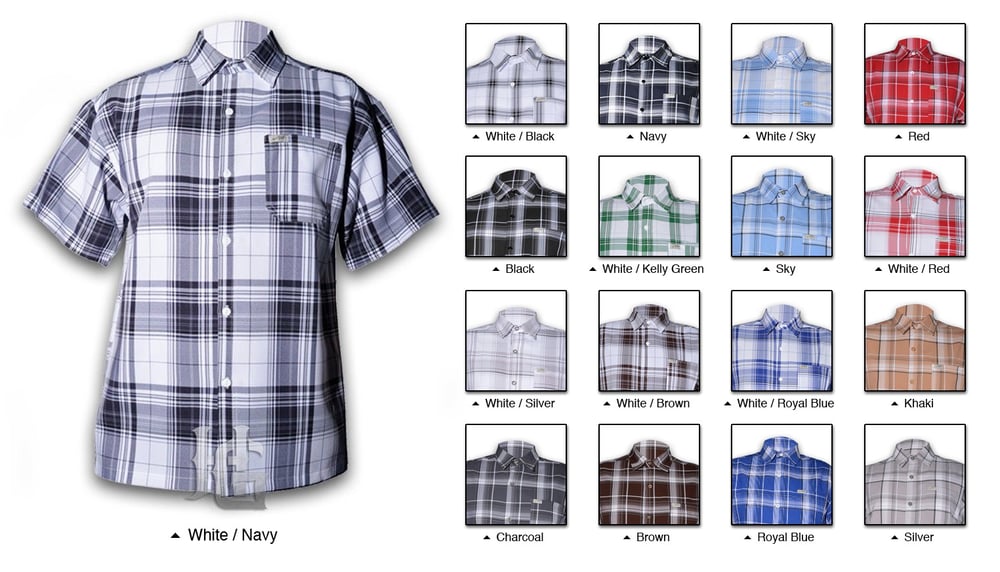 Cal Top short sleeve plaid shirts feature collared neck, button-up front construction, left chest pocket, complementary colored buttons. 100% polyester. Made in the USA.